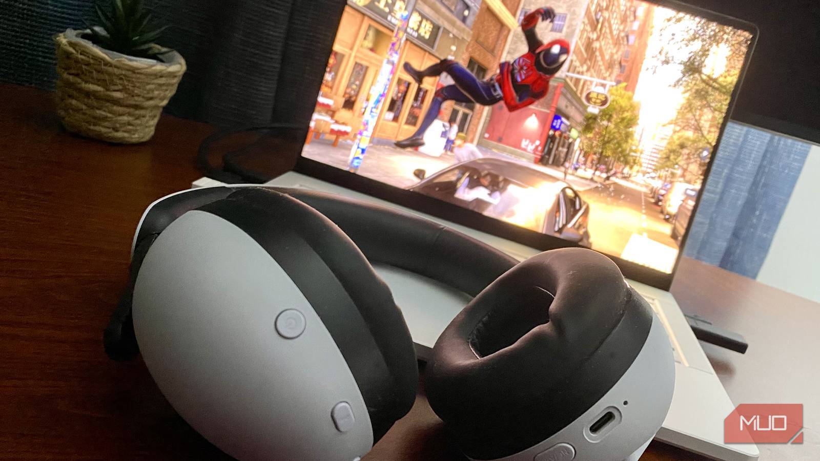 Sony Inzone H9 headset with a laptop playing Marvel's Spider-Man 2 Credit: Dave Meikleham / MakeUseOf